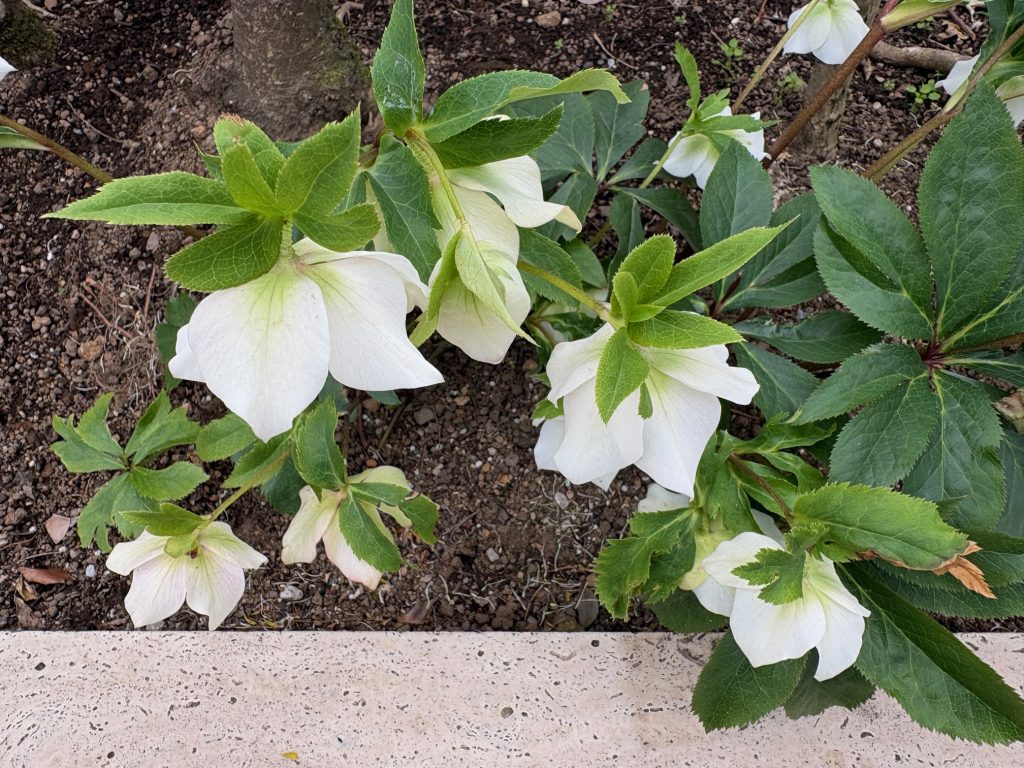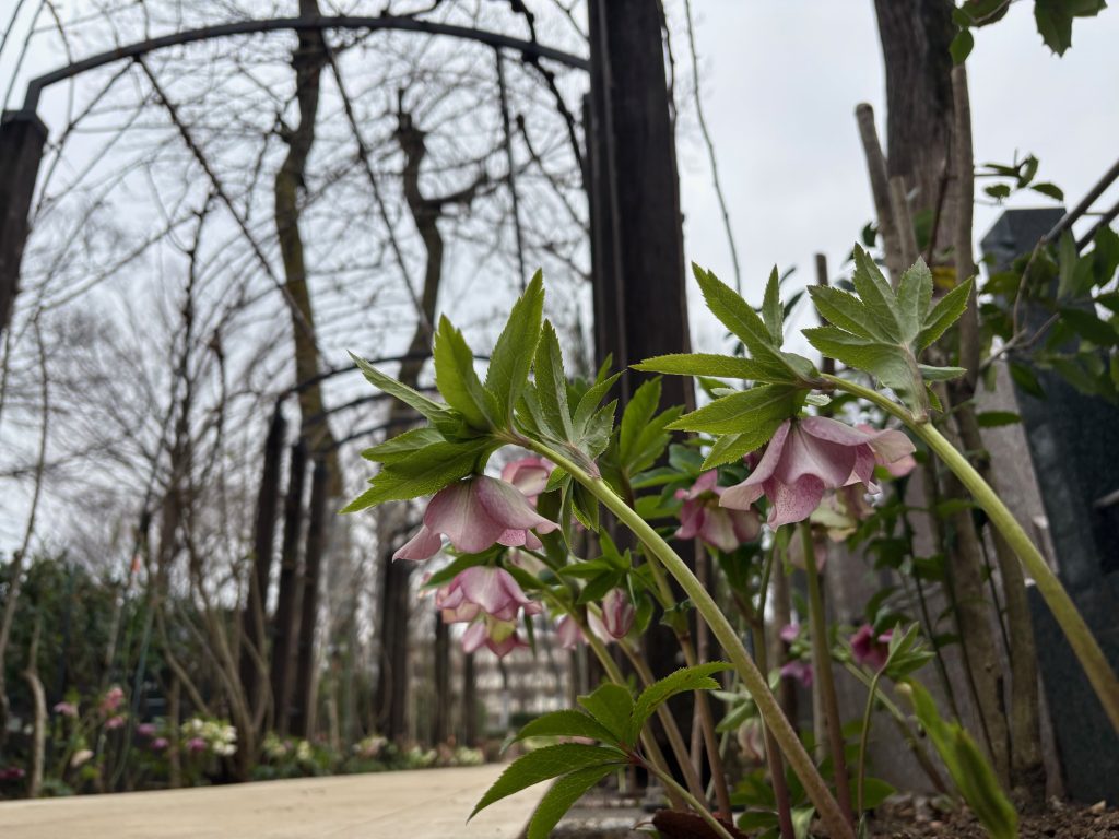 ↑正面のバラのアーチ両脇には白とピンクのクリスマスローズが咲いています。