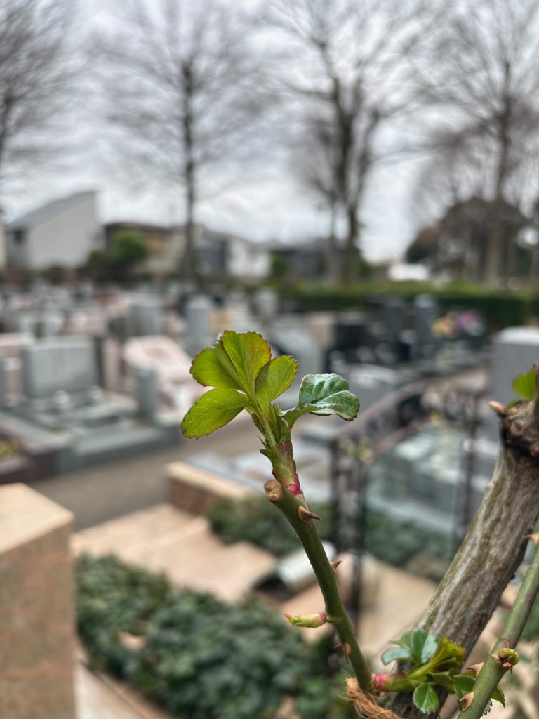 ↑冬の間にバッサリ剪定したつるバラも、小さな新芽がでてきました🌱
